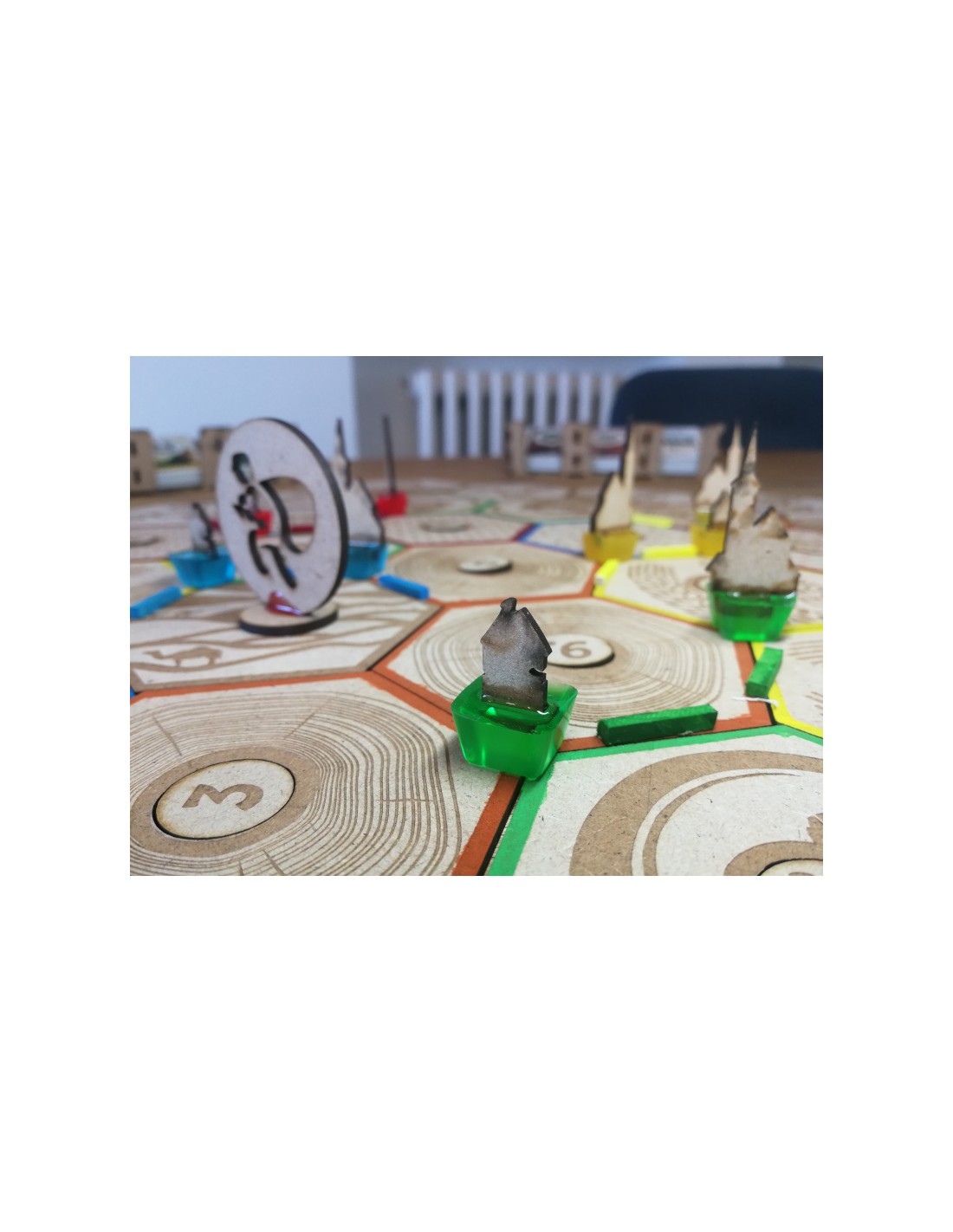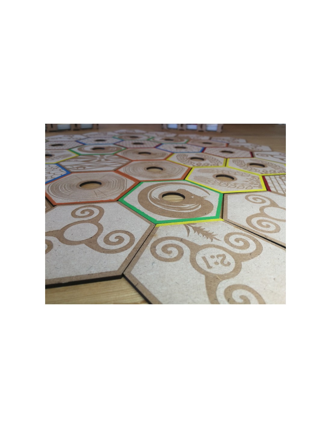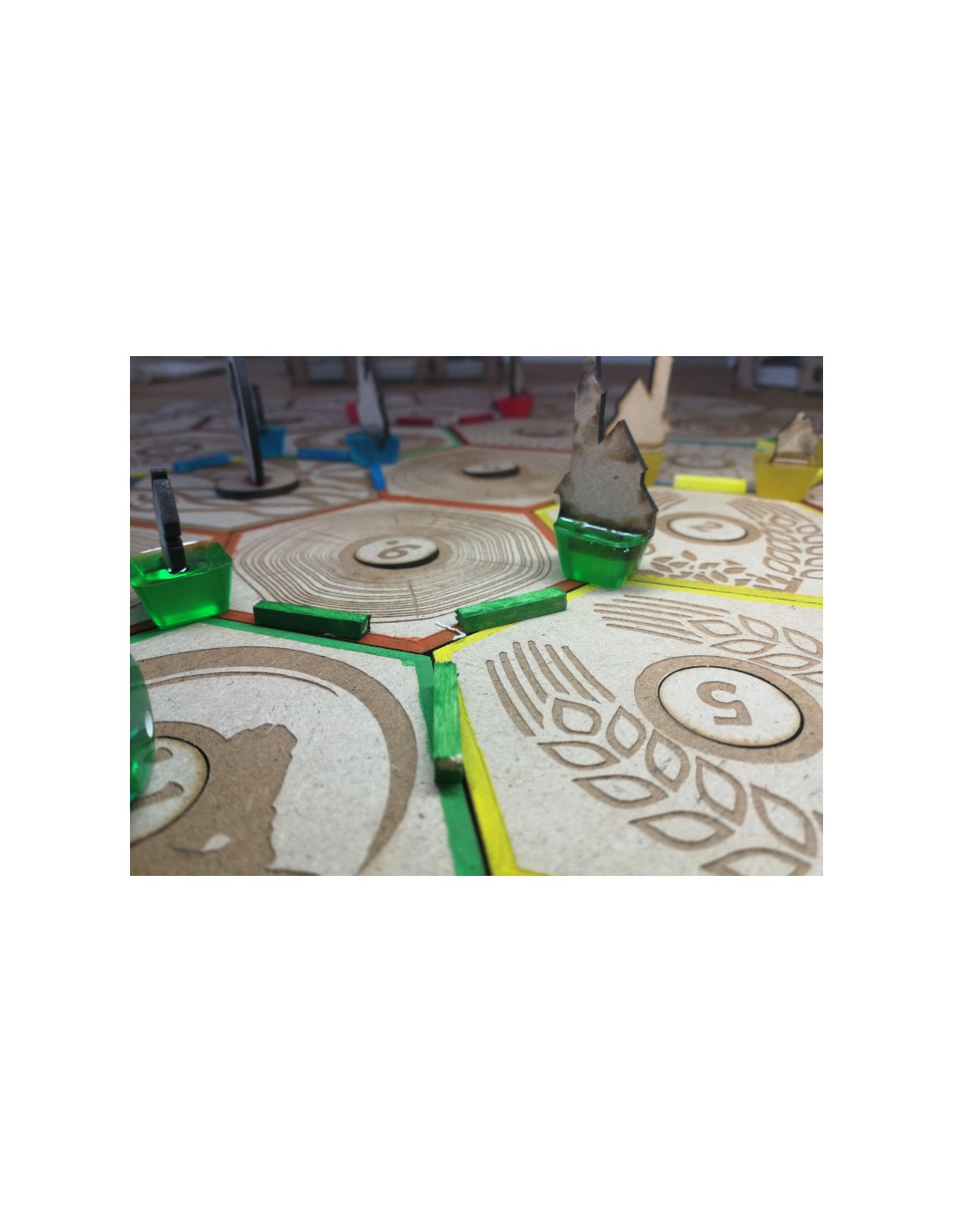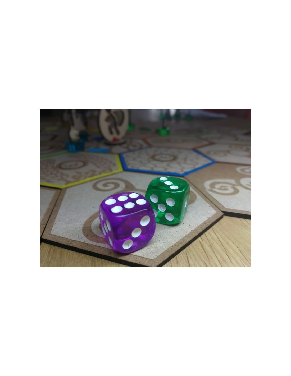 - Diseño Exclusivo: Los hexágonos de los recursos, las cartas (fichas) y el dado están fabricados con cuidado