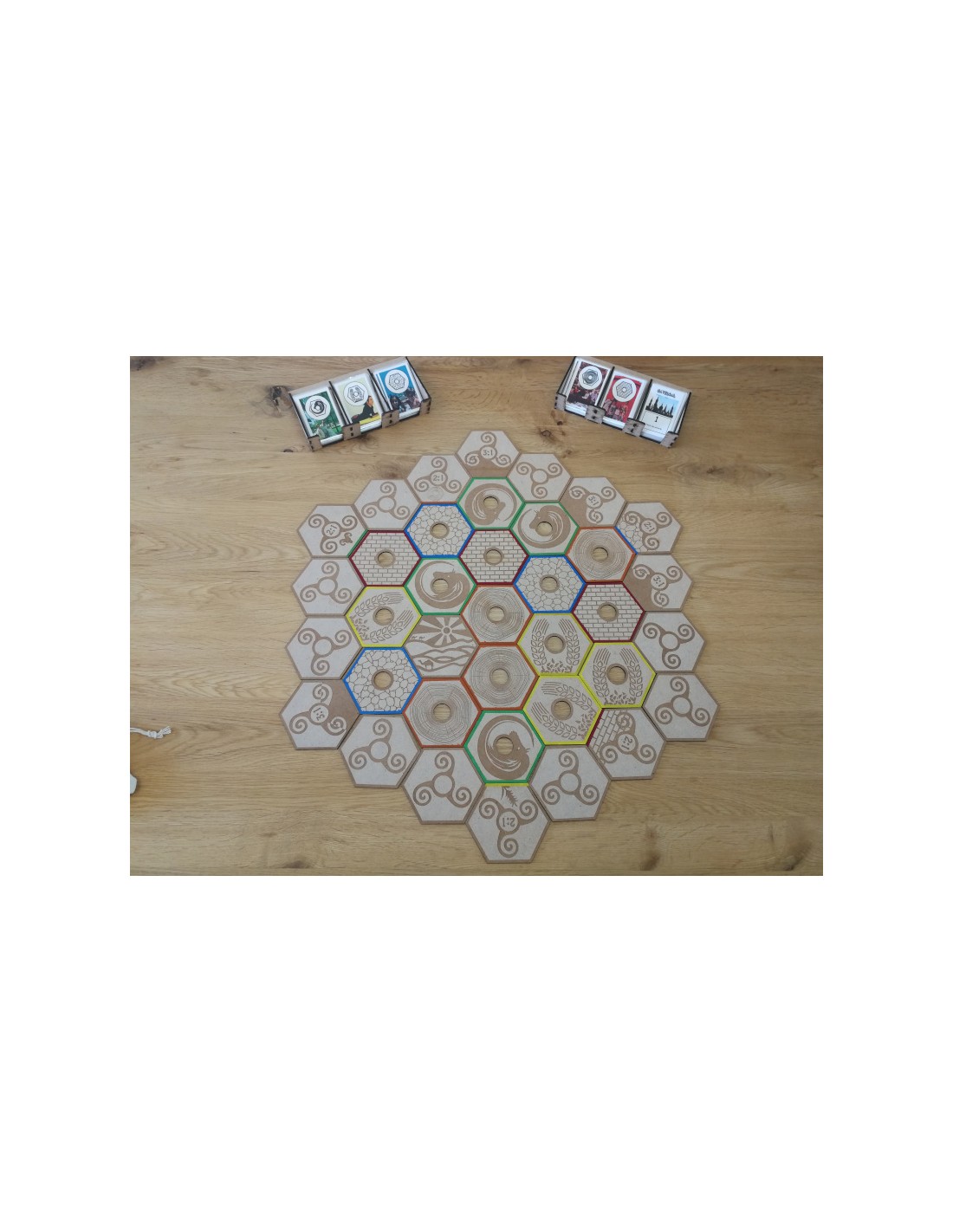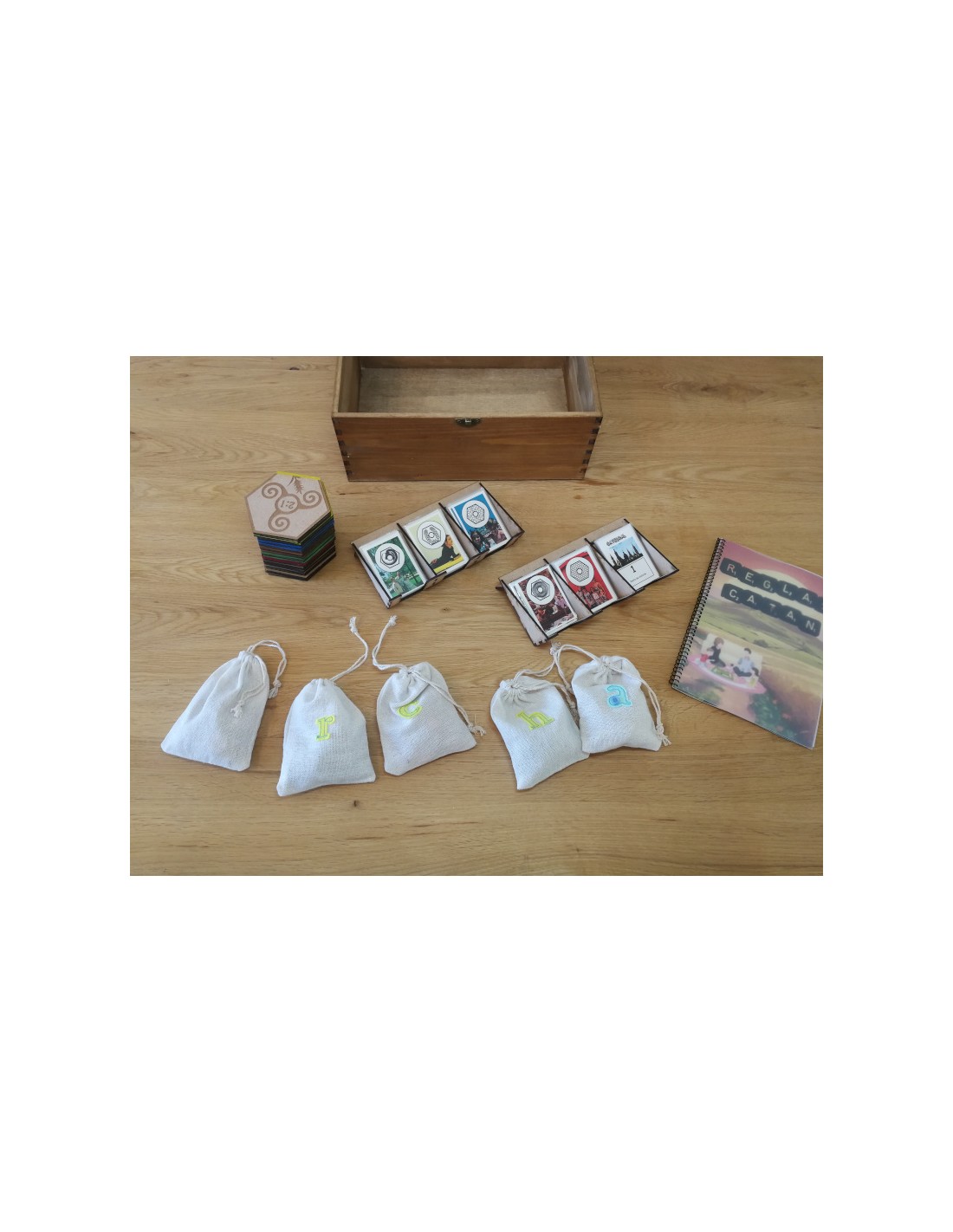- Organización Impecable: El juego se entrega en una caja de madera robusta y con compartimentos diseñados a medida para guardar ordenadamente todos los hexágonos y componentes.