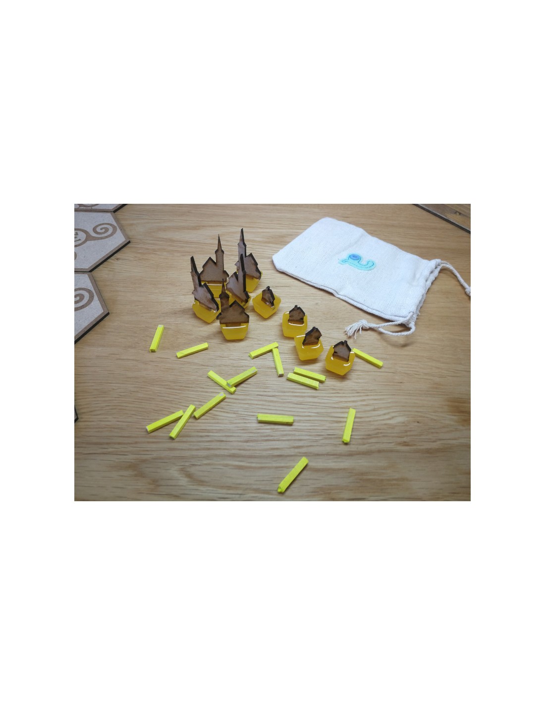 - Detalles Artesanales: Los recursos de los jugadores se almacenan en bolsas de tela natural personalizadas, añadiendo un toque rústico y práctico, incluso en la versión de Metacrilato.