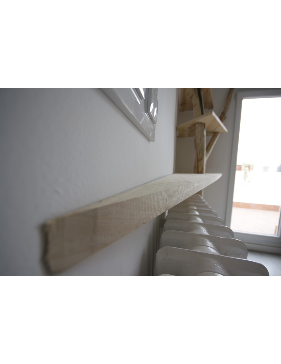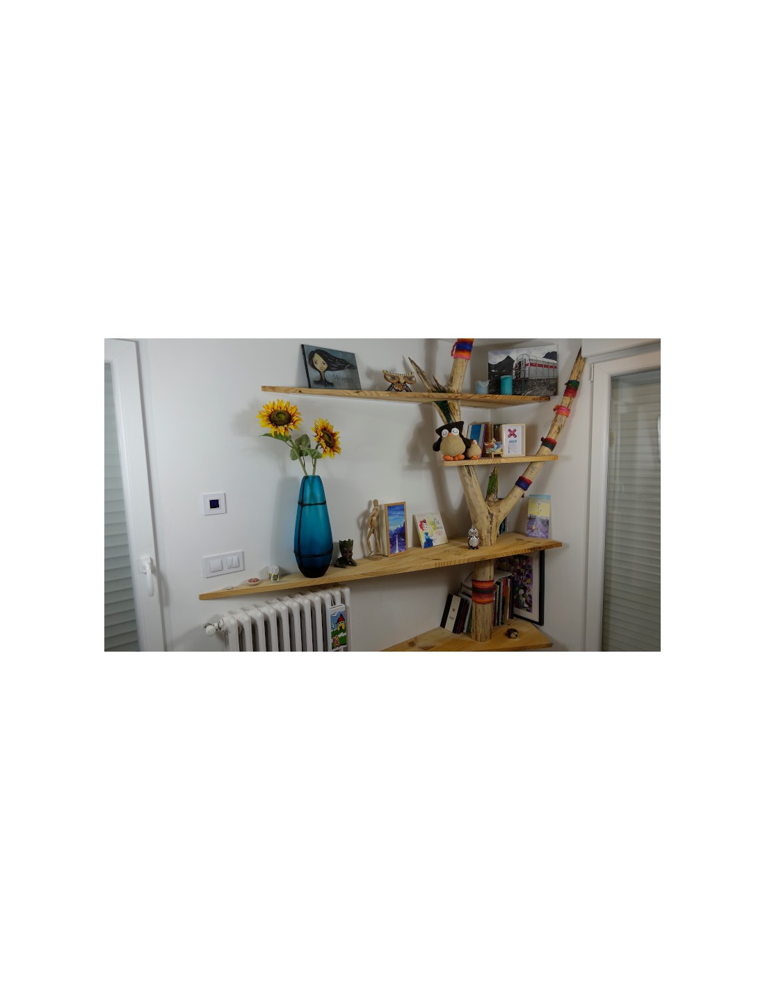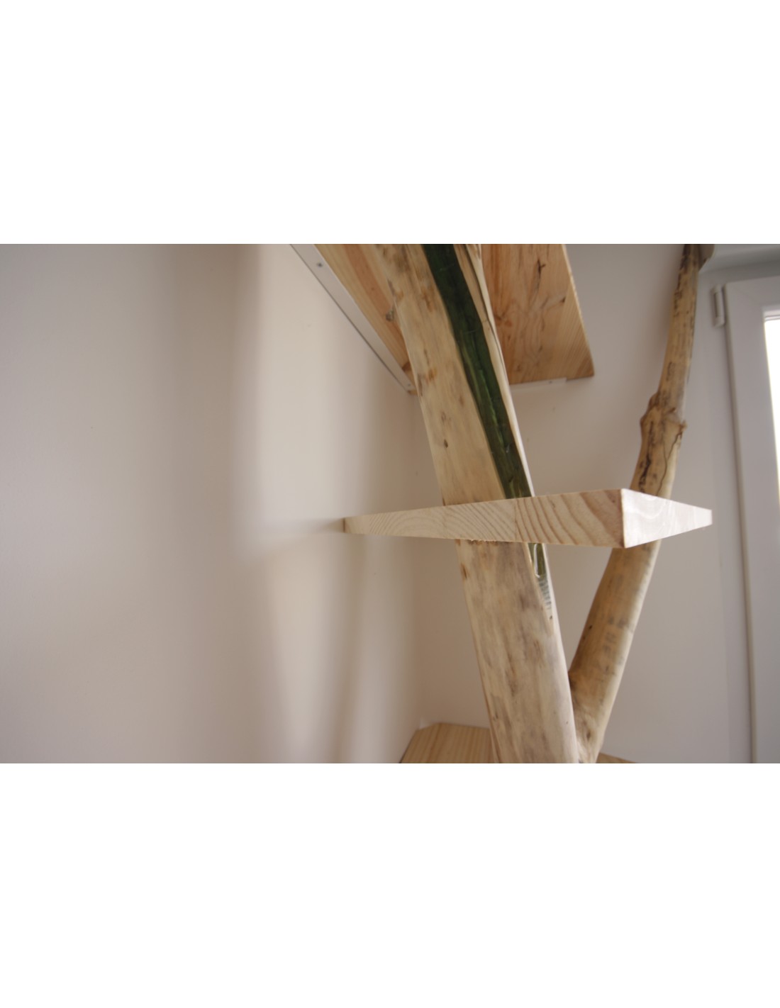 • Diseño a Medida: Las baldas de madera clara están cortadas con formas geométricas asimétricas, generando un dinamismo visual que evoca las ramas extendiéndose por su pared. El diseño se adapta perfectamente al rincón, optimizando el almacenamiento.