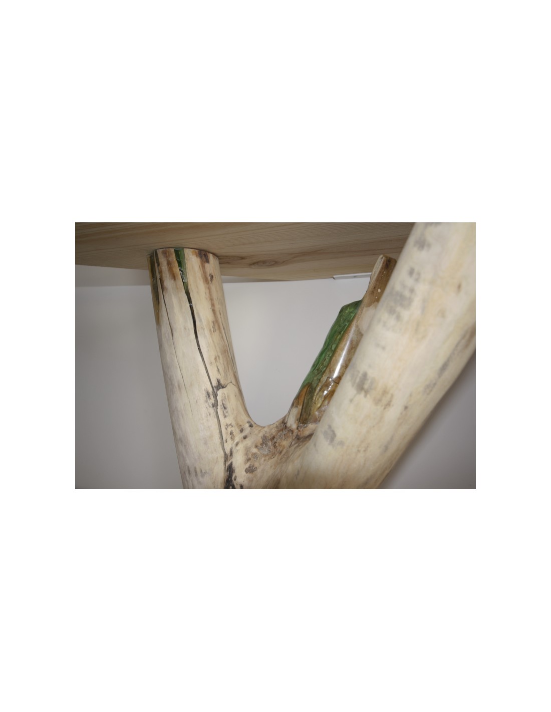 • Estructura Orgánica: La columna central imita el tronco de un árbol, utilizando ramas naturales tratadas y ensambladas de forma artesanal. Es una fusión perfecta entre carpintería de precisión y arte natural.